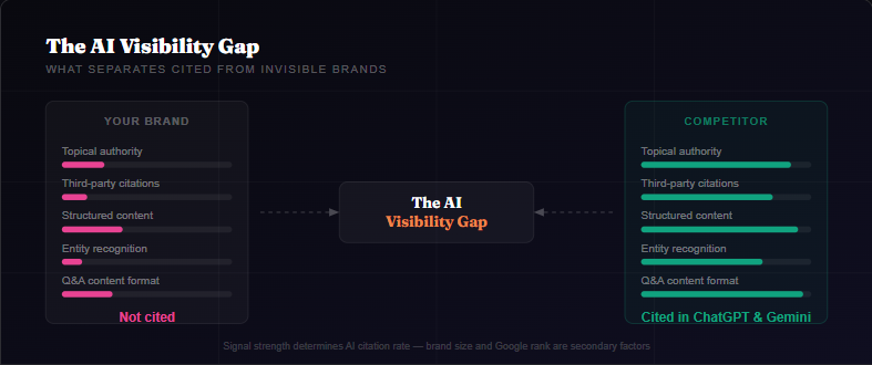 The AI Visibility Gap: brands with strong topical authority, structured content, entity recognition, and third-party citations consistently appear in ChatGPT and Gemini – those without them don’t.